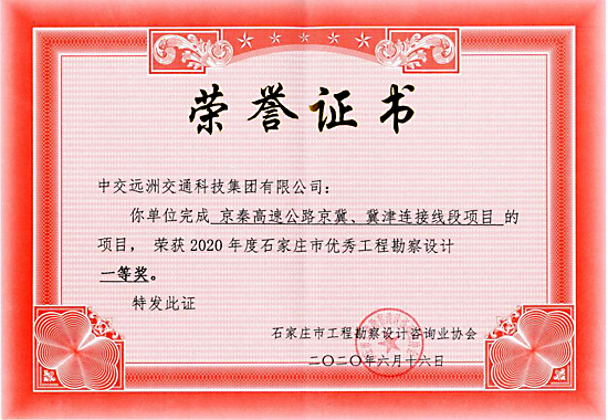 京秦高速公路京冀、冀津連接線段項(xiàng)目的項(xiàng)目榮獲2020年度石家莊市優(yōu)秀工程勘察設(shè)計(jì)一等獎(jiǎng)