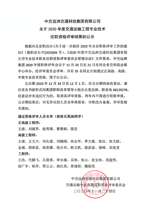 關(guān)于2020年度交通運(yùn)輸工程專業(yè)技術(shù)任職資格評審結(jié)果的公示