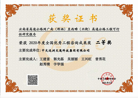 云南省高速公路網(wǎng)廣南(那灑)至西疇(興街)高速工可榮獲2020年度全國優(yōu)秀工程咨詢二等獎
