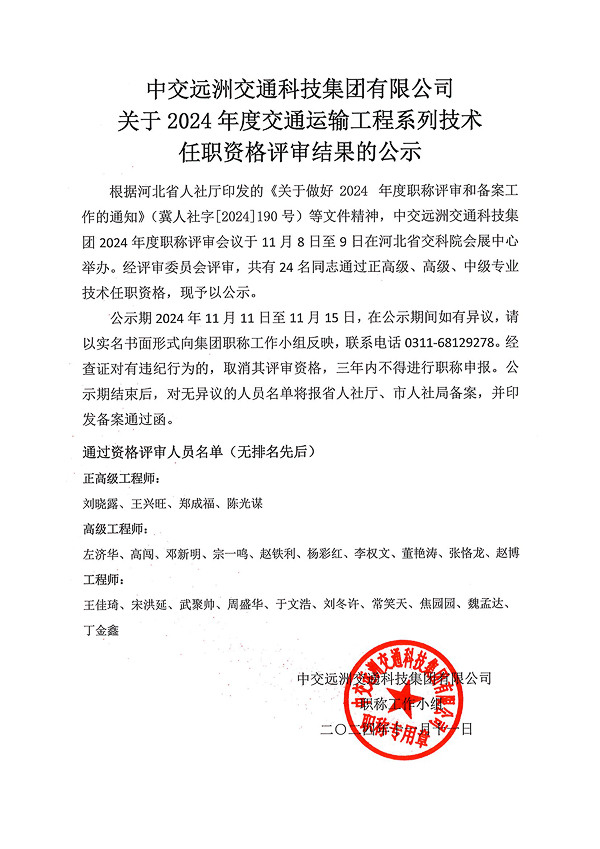中交遠洲交通科技集團有限公司關(guān)于2024年度交通運輸工程系列技術(shù)任職資格評審結(jié)果的公示